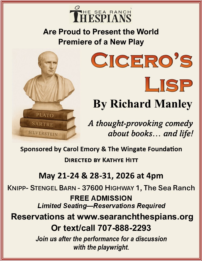 The Sea Ranch Thespians is a nonprofit organization dedicated to enriching the literary and cultural life of the coastal community by presenting free high-quality plays and providing opportunities for actors, directors, and craftspeople to experience the joy of theatrical production and performance.